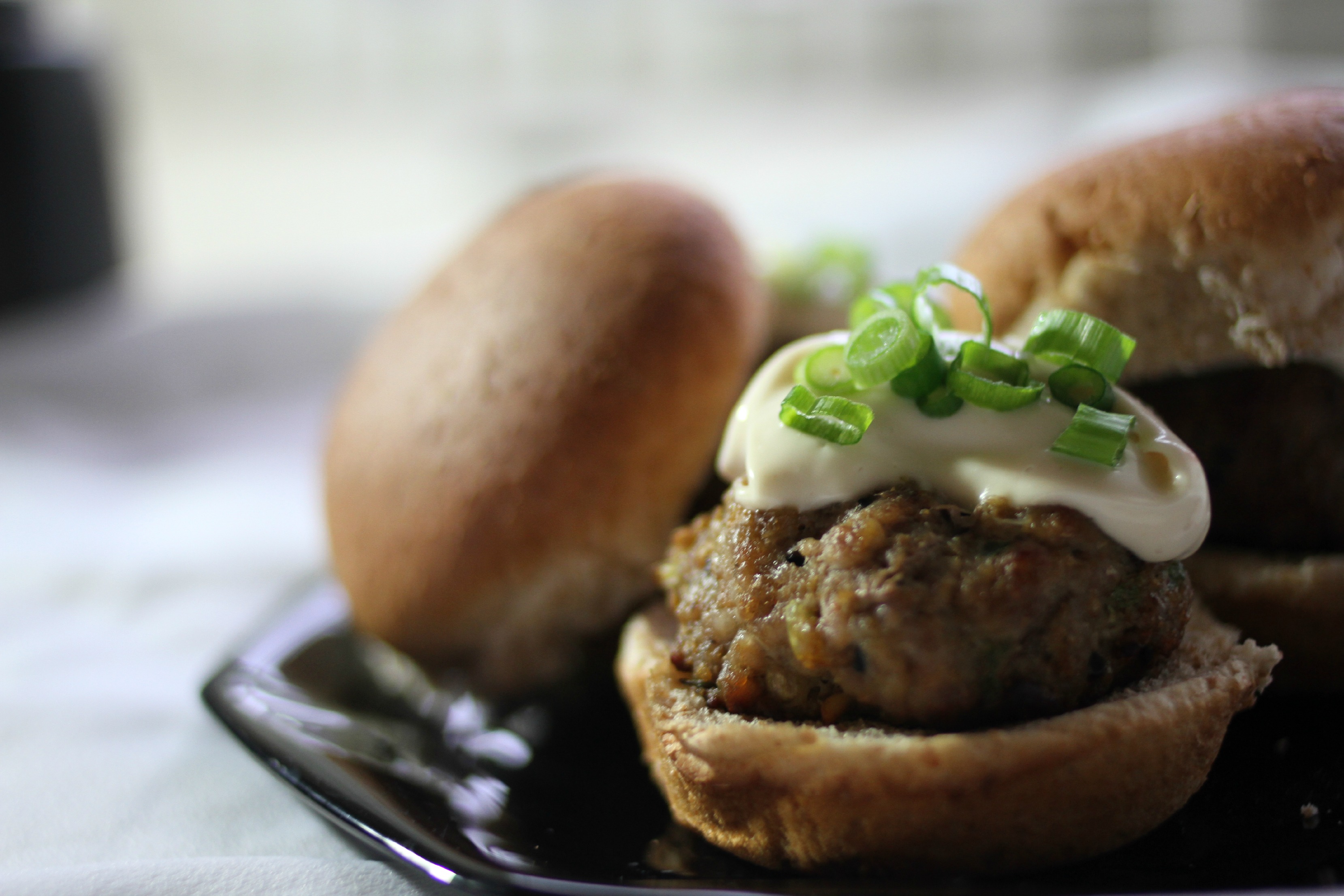 Split rolls and top each with a burger. Spread 1 tsp teriyaki mayonnaise on each